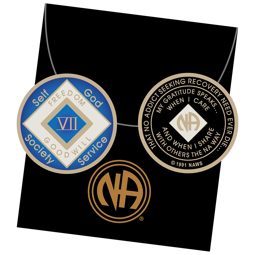 These medallions feature a three-color paint design on a gold-tone base and are delivered in a black velveteen pouch with the NA symbol in gold. Nine-color combination available in one thru 60 years, 18 months, and eternity; English only.